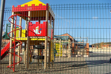 Устанавливают зеленые или синие сетки. Высота — 2,5 м. Ворота — с доводчиками. Забор должен быть безопасным — без острых краев.